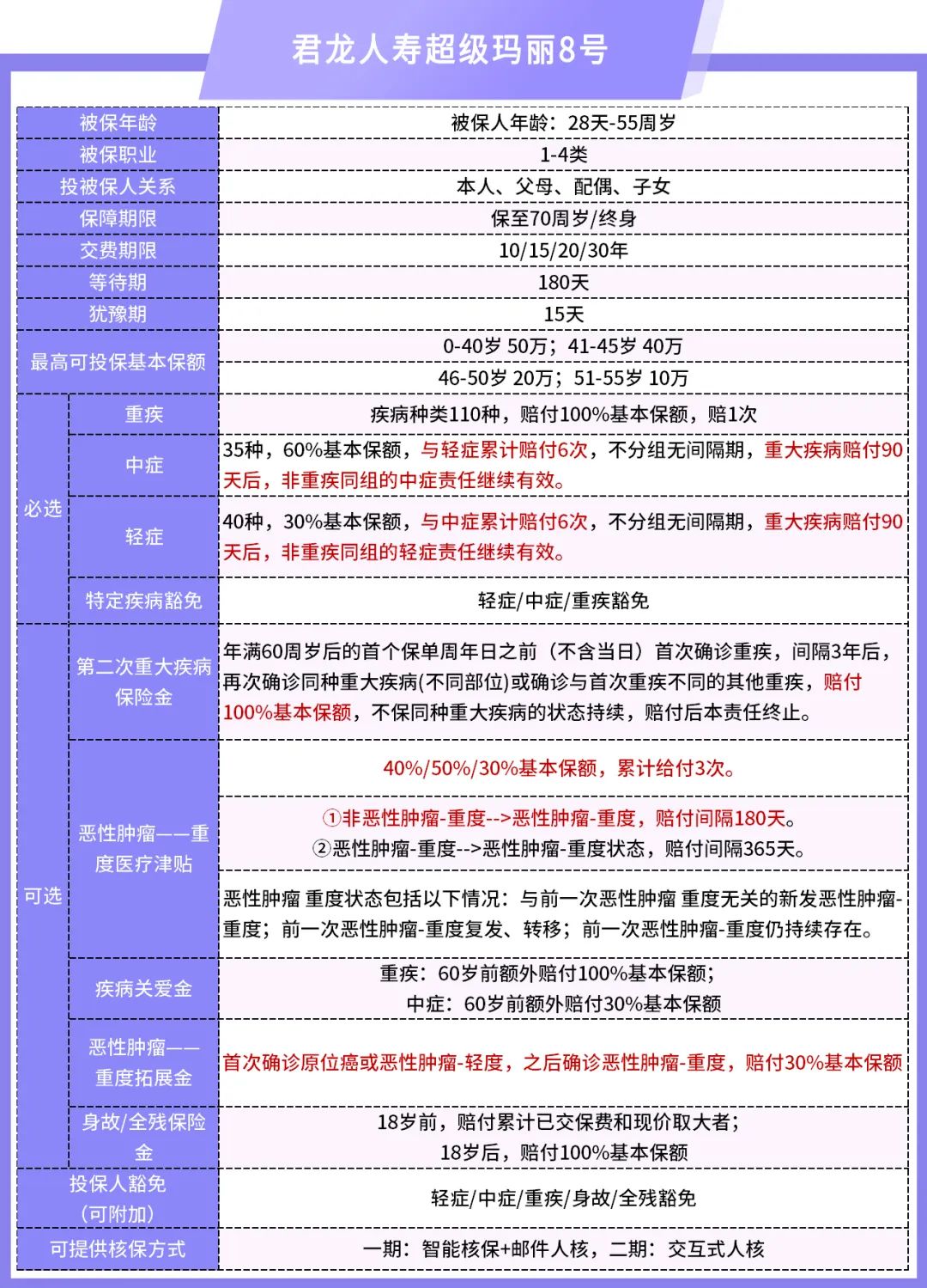 ● 中症:35种,60%基本保额,与轻症累计赔付6次,不分组无间隔期,重大疾病赔付90天后,非重疾同组的中症责任继续有效。