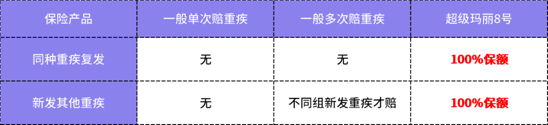 对重疾险有一定了解的朋友,应该知道很多重疾多次赔的产品是不保“同种疾病二次赔”的,更别说单次重疾险了,但是超级玛丽8号的【第二次重大疾病】可以做到同种额外赔100%的基本保额。
