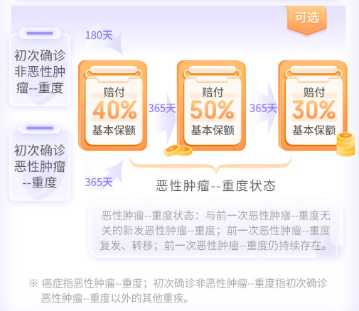首次确诊原位癌或恶性肿瘤-轻度,之后确诊恶性肿瘤-重度,可以额外赔付30%基本保额。