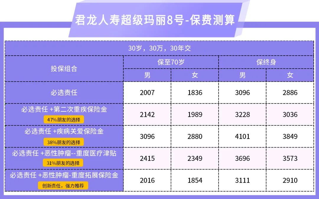 玛先生,家庭顶梁柱,30岁,购买了超级玛丽8号重疾保险产品50万,30年交,保终身,选择必选责任+疾病关爱金+第二次重大疾病保险金+恶性肿瘤-重度医疗津贴+恶性肿瘤-重度拓展保险金,每年保费8075元。