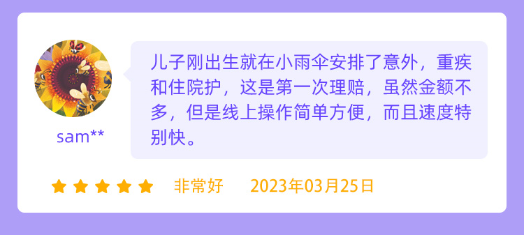 她在理赔服务评价中写道:“做了很多功课之后决定在小雨伞投保,看中了小雨伞的售后服务。在这里特别感谢小易老师,有问必答,热心负责,非常专业地指引理赔。”