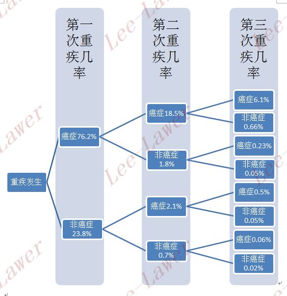 根据知乎大V老羊的测算,第二次得重疾,重疾是癌症的概率是18.5%,非癌症只有0.7%。