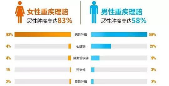 在2018年保险公司的理赔数据里显示,恶性肿瘤在女性重疾理赔的占比高达83%,男性58%。