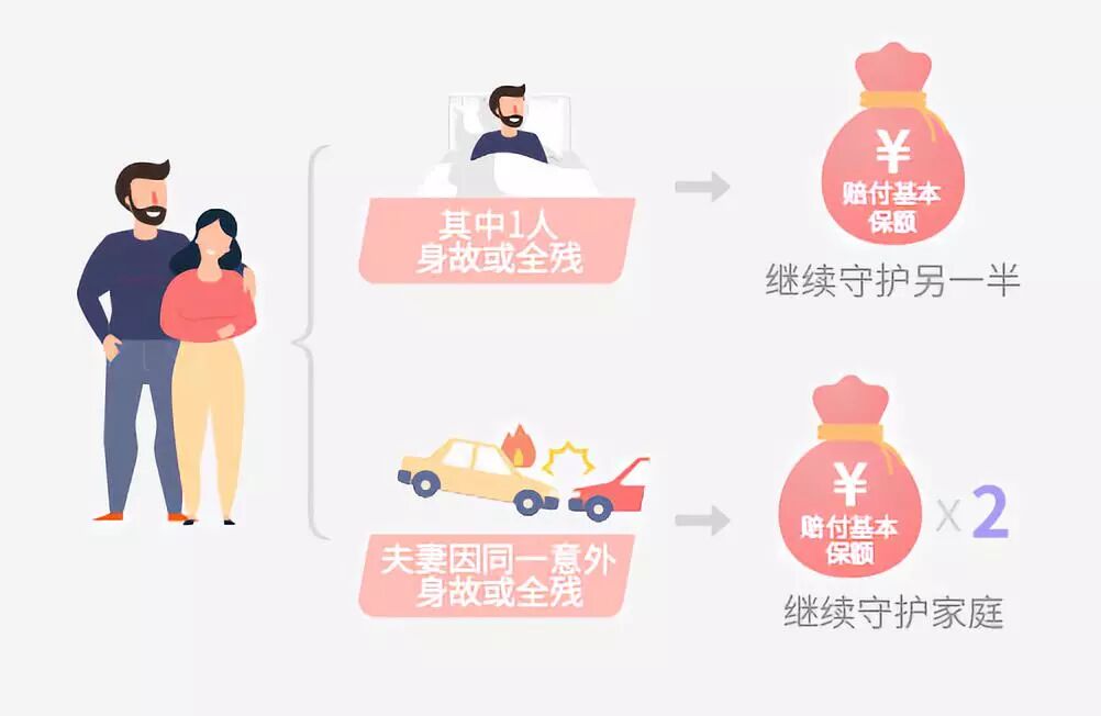假设A小姐夫妻买了100万保额的小雨伞-小两口夫妻定寿,如果A小姐或A先生其中任何一人因为意外或者非意外身故/全残,保险公司都会赔付100万,合同终止。
