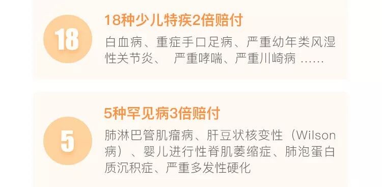 * 特疾赔付:18种少儿特定疾病,保额×2,最高可达200万;
