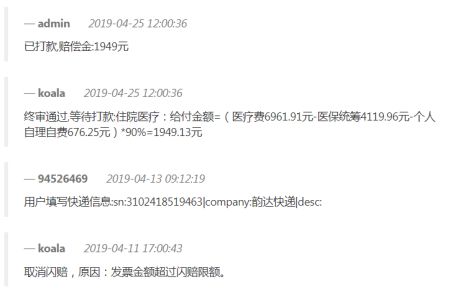 2019.04.25 理赔审核通过,于女士获得赔偿金1949元