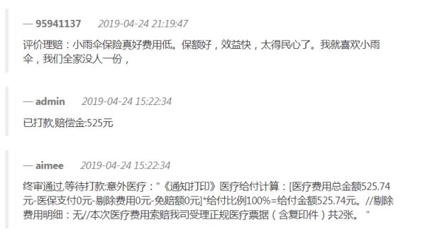 2019.04.24 理赔审核通过,于女士获得赔偿金525.74元