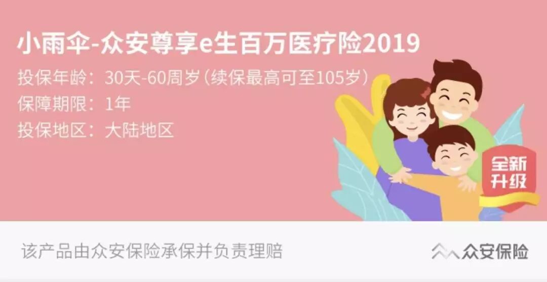 众安的尊享e生——百万医疗险的鼻祖,号称【国民医保】。尊享e生2019版最近在小雨伞平台上线啦,尊享e生自上线四年来,已经完成了13次升级,下面小编就带大家来看看在潜心钻研了一年的时间里,国民医保都迎来了哪些重大升级: